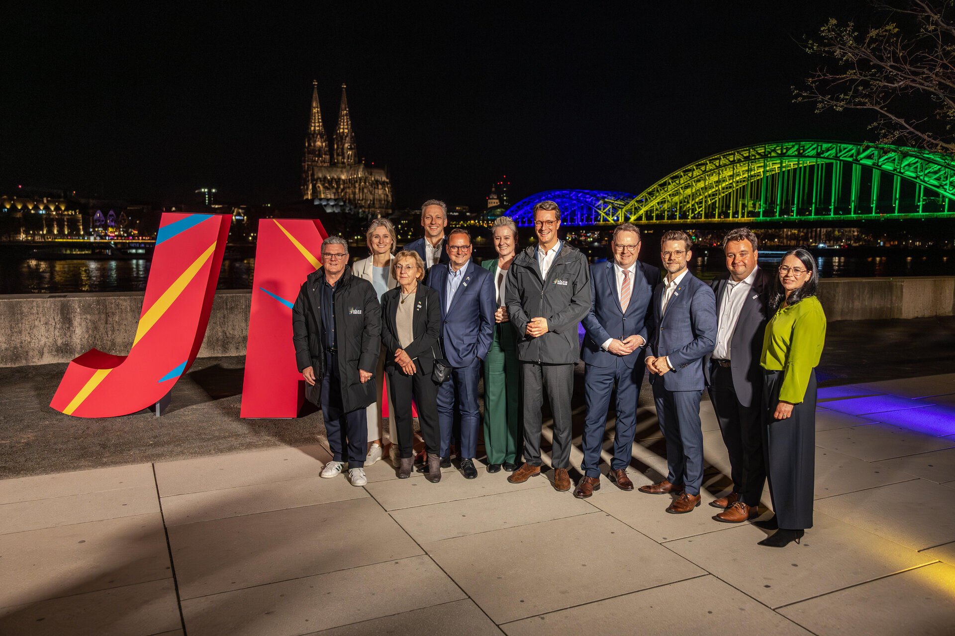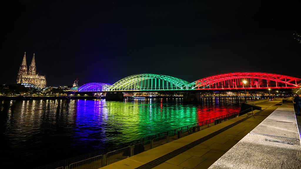 Passend dazu leuchtete die Hohenzollernbrücke, die den Rhein in Köln überspannt, in den Farben der olympischen Ringe.